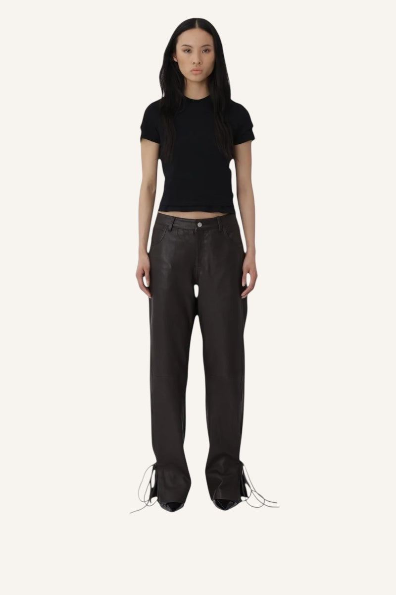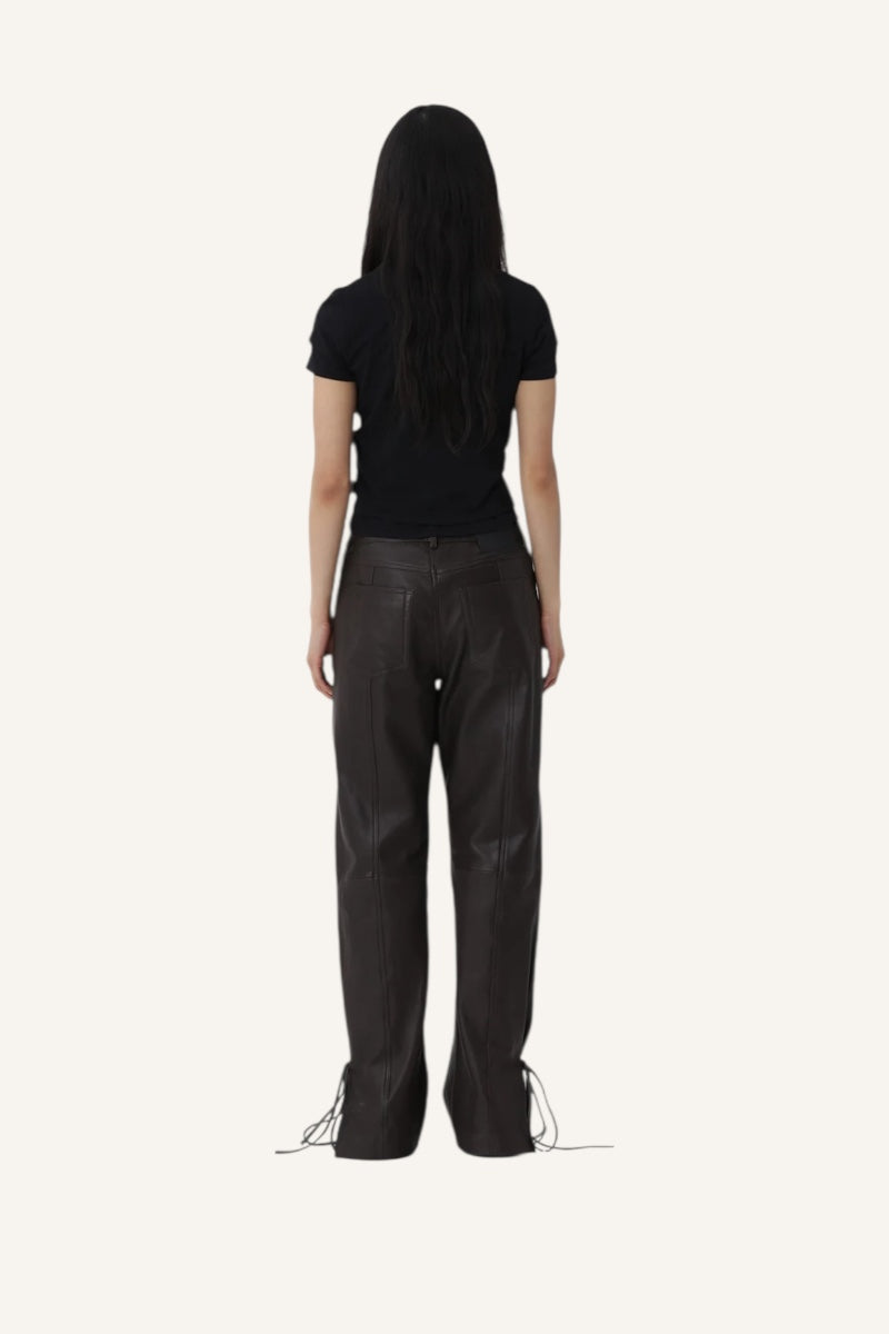 The Bella String Fit trousers with classic leather tailoring has a sleek beautiful silhouette. They are crafted from soft leather with adjustable string details for a custom shape.