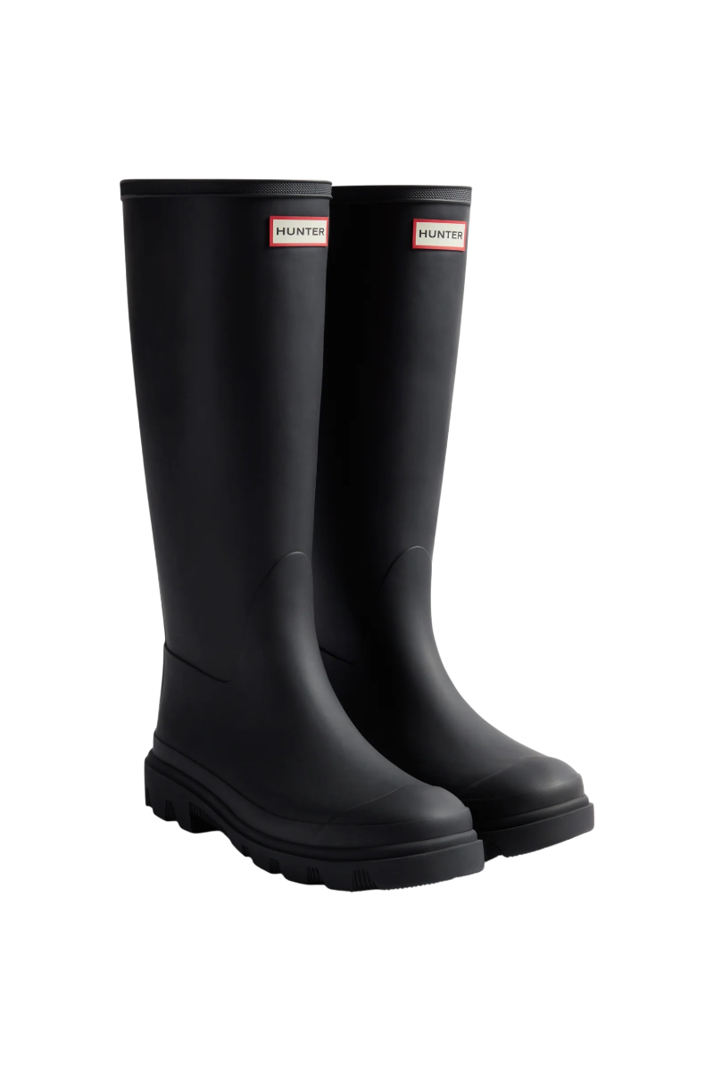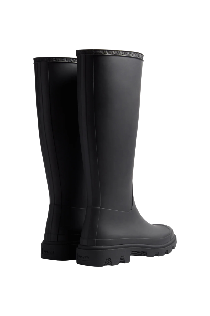 Stay dry in style with the fully waterproof Unisex Downpour Tall Rain Boot in black from Hunter. Featuring a sleek design, lightweight molded outsole with nature-inspired tread, and a roomier calf fit. Handcrafted with a heritage topbind.