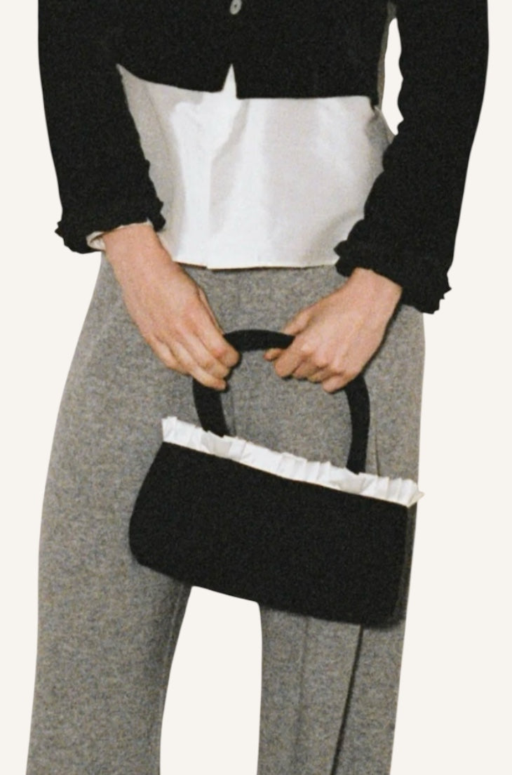 The Hai Estelle Bag in Black Velvet and Ivory is crafted out of silk and has a rectangular shape. The top of the bag is ivory dupion silk ruffles. Double straps to be worn over the wrist.
