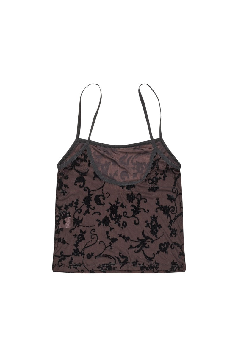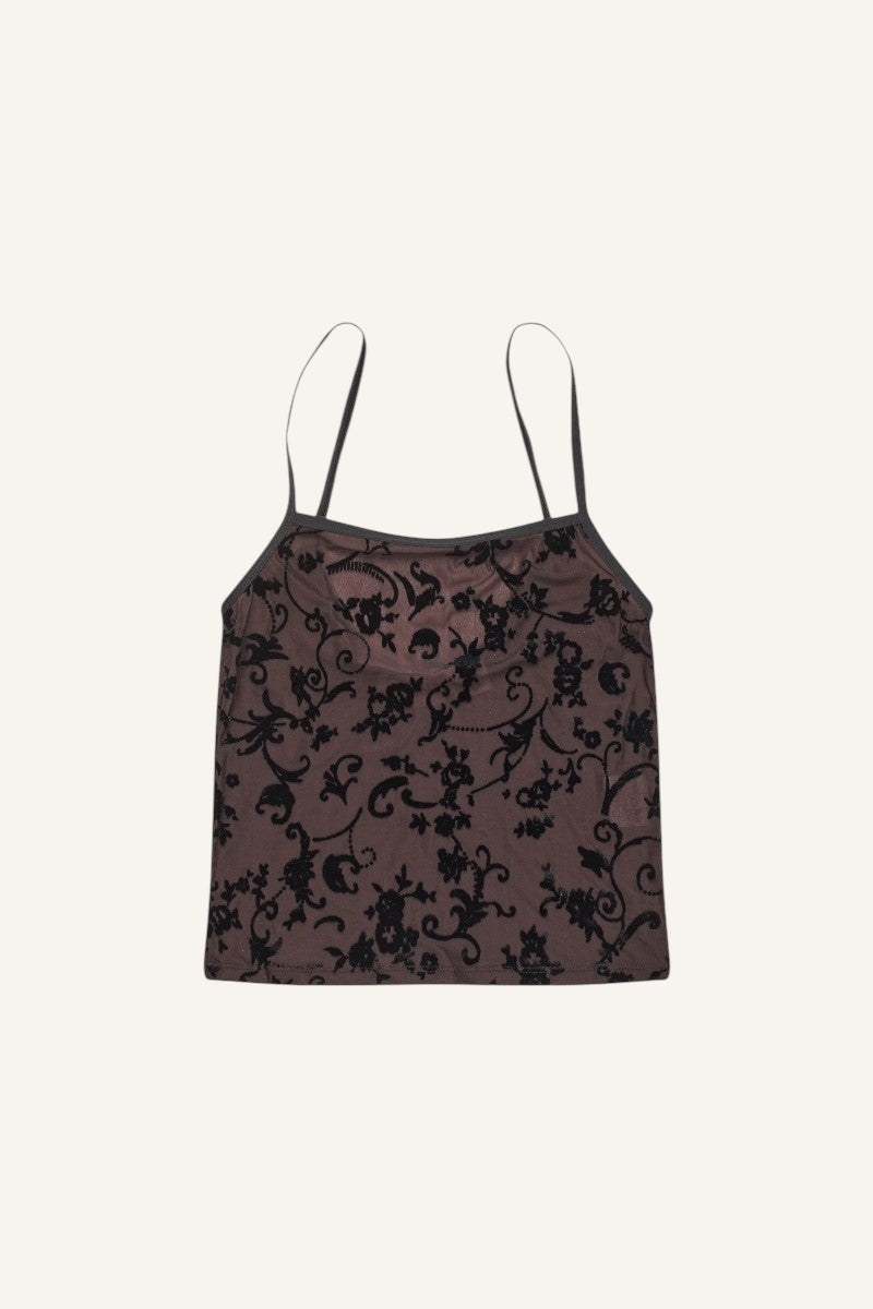 Gigi Top from KerneMilk now in a dark brown mesh quality. This top has a tight fit with a deep back. It comes with thin black elastic straps. The top features an all-over black floral burn-out print. Style with the reversed Wonder pants or the Sascha skirt for a cool set.