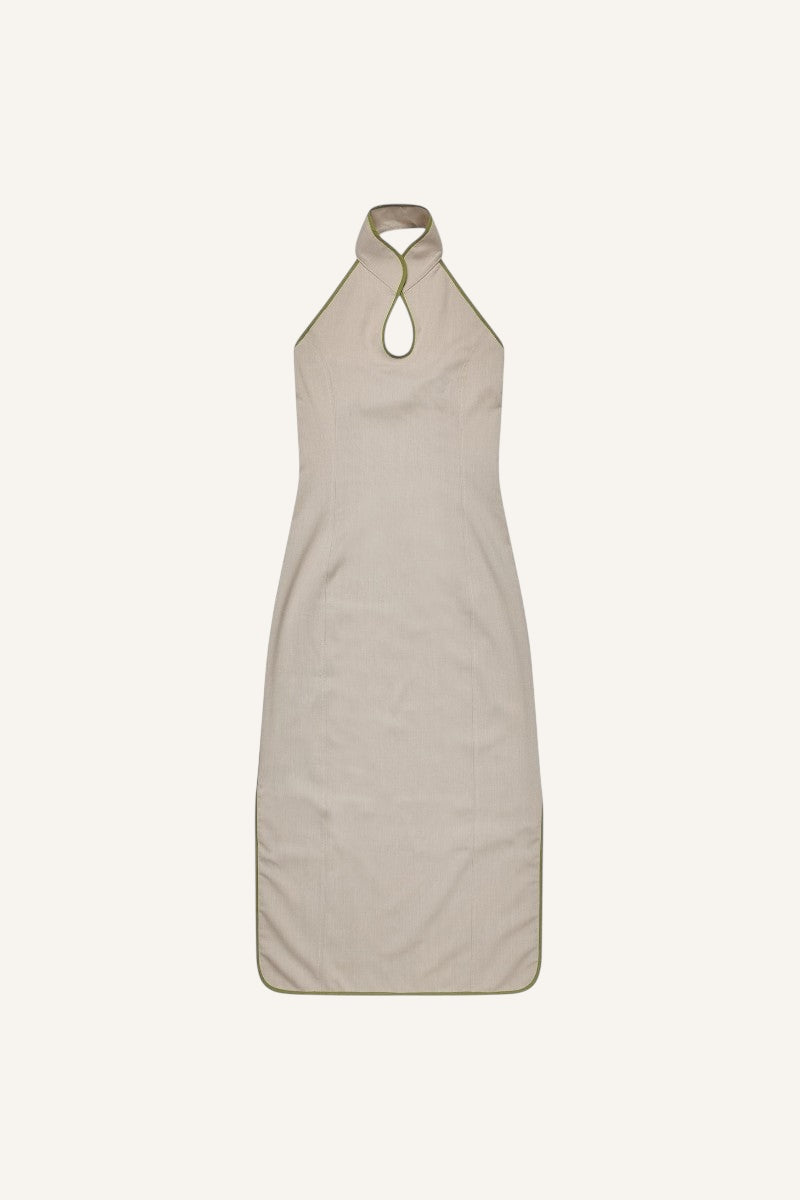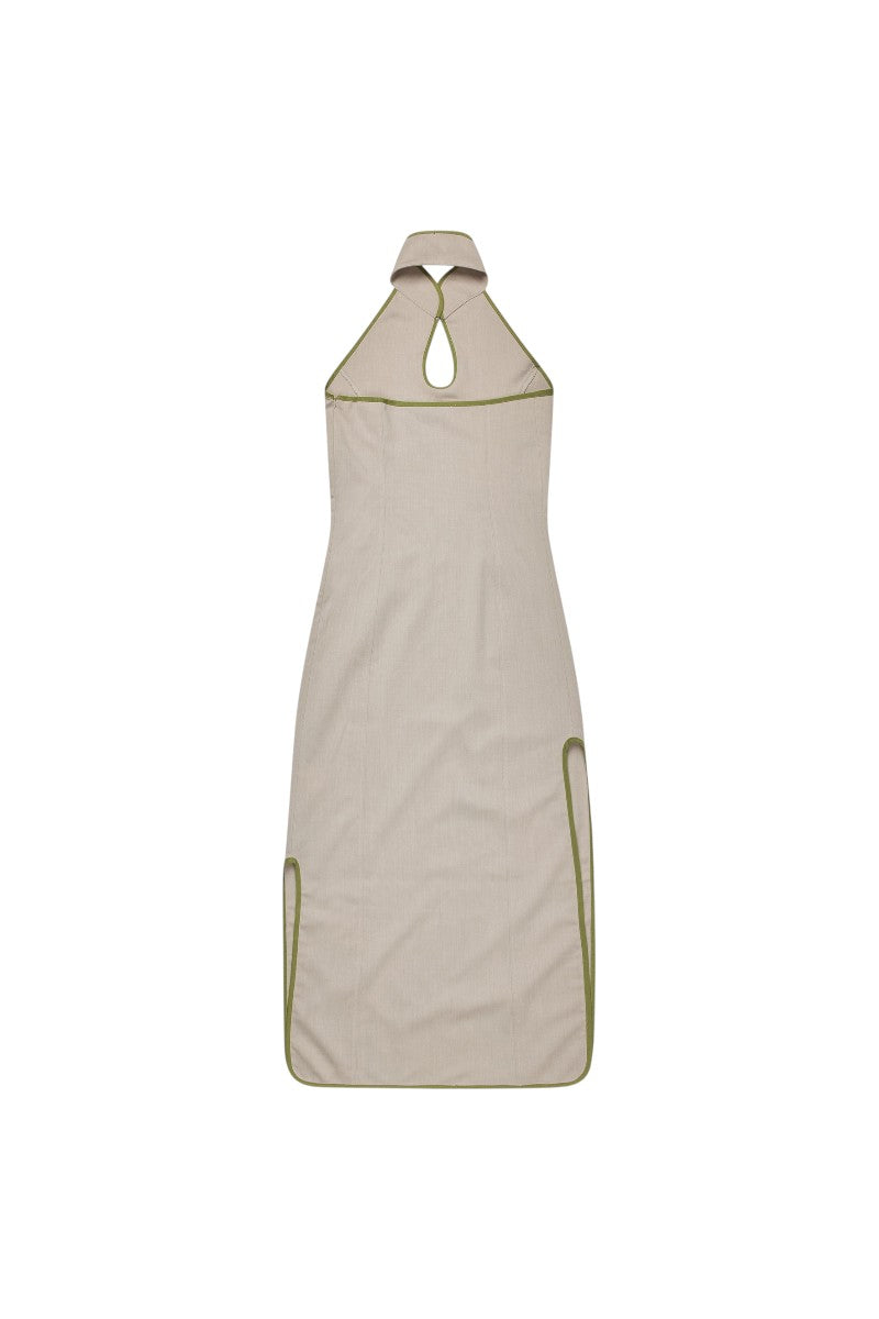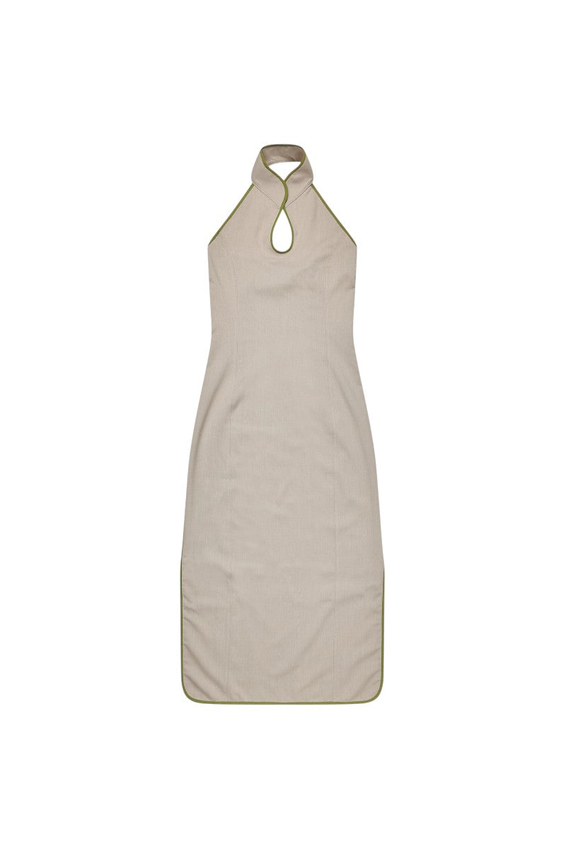 The classic Happy Moon Dress from KerneMilk now available in a sand colored woven wool quality. The dress features a collar stand with a hook-and-eye closure at front. It has a green edge tape detailing and an asymmetrical slit detail on each side. The dress comes with an invisible zipper on the left side of the garment.