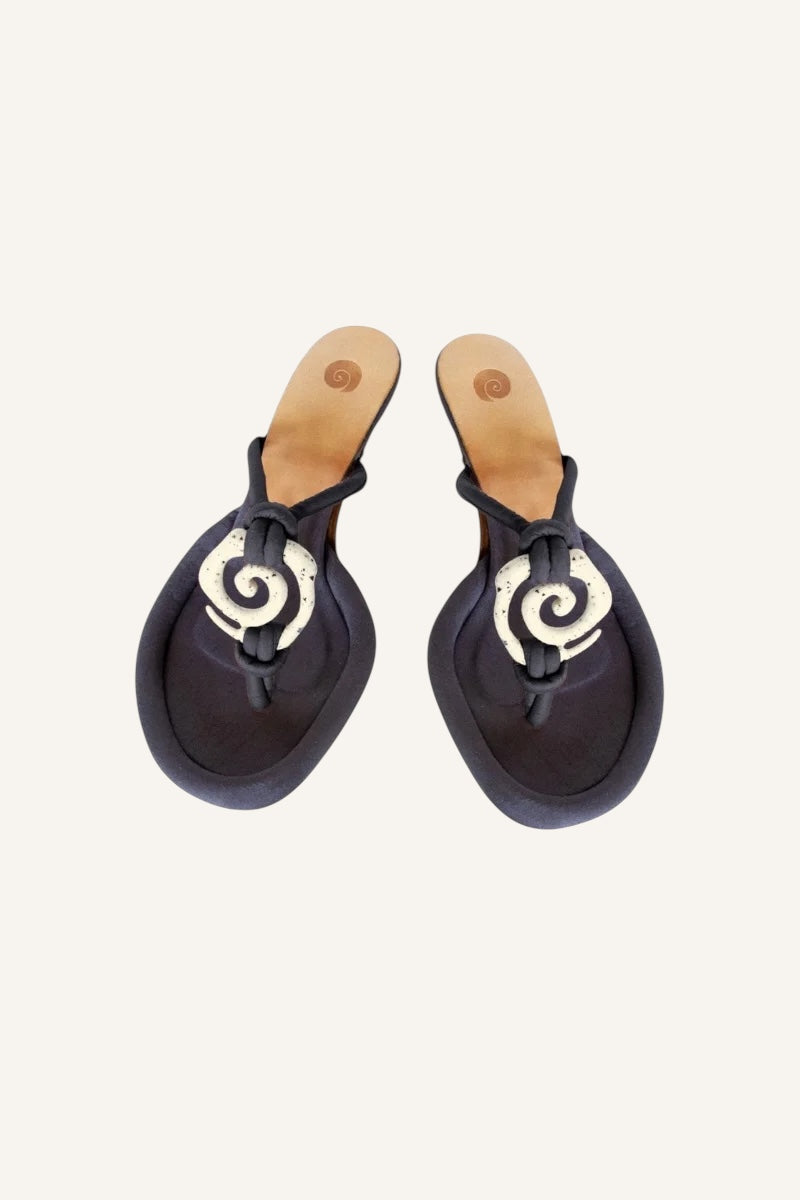 Ugo Paulon killon with a rounded rand surrounding the sole for extra forefoot emphasis, thong strap upper with a metal swirl trim and wooden beads. The killon Mule has a 50mm heel.