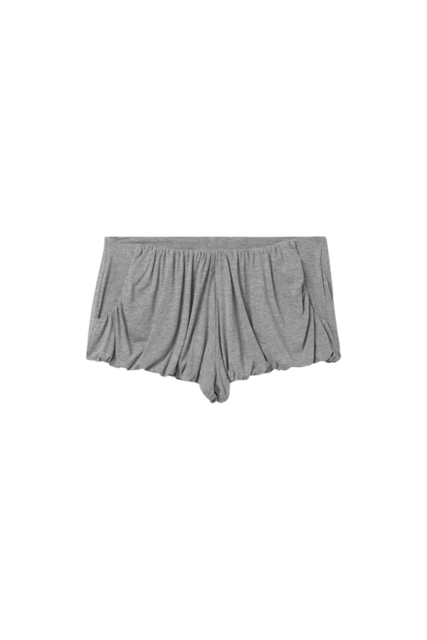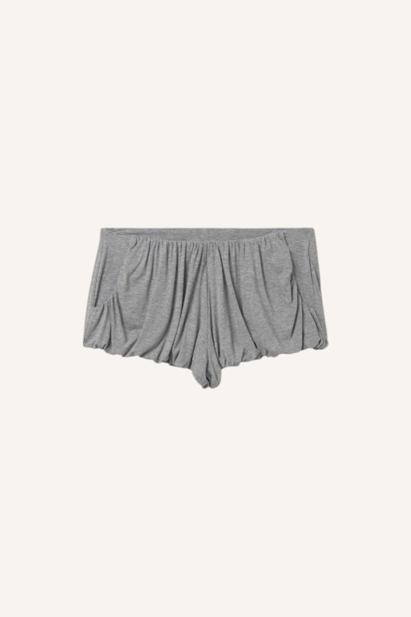 Grey melange women's draped mini shorts from Gimaguas. Voluminous silhouette with gathered detailing along the hips. Elasticated waistband with crescent-cut side pockets.