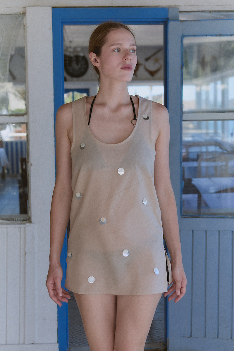 Mini dress with slit in sheer cotton voile fabric with high slit and hand sewn sequins